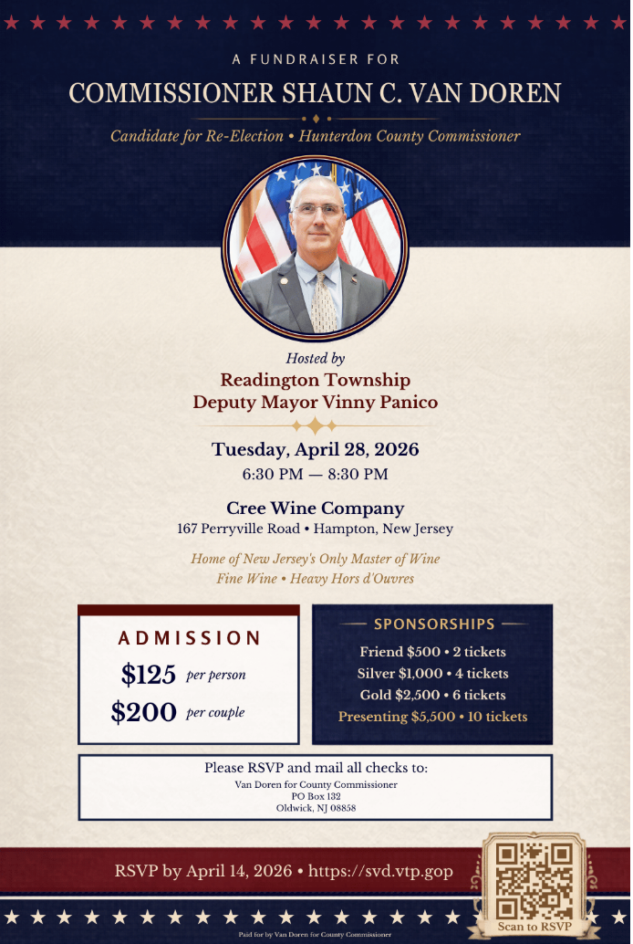 Join us for a Fundraiser in Support of Commissioner Shaun C. Van Doren, Hosted by Readington Township Deputy Mayor Vinny Panico