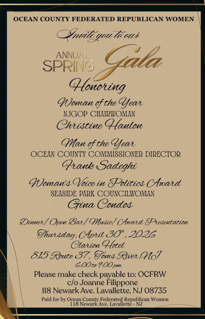 The Ocean County Federated Republican Women invite you to our Annual Spring Gala honoring Woman of the Year NJGOP Chairwoman Christine Hanlon, Man of the Year Ocean County Commissioner Director Frank Sadeghi, and Woman’s Voice in Politics Award Seaside Park Councilwoman Gina Condos.