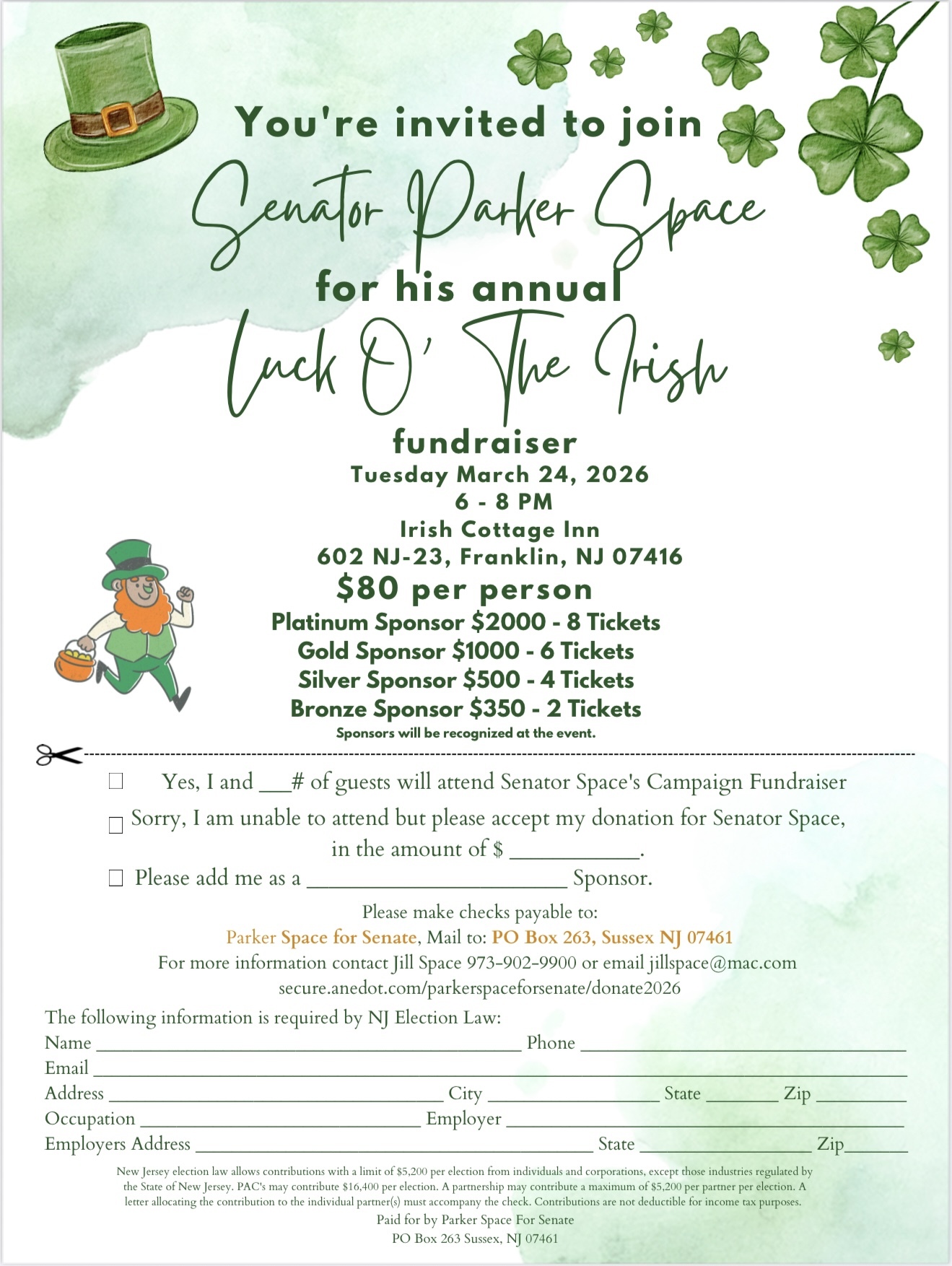 You’re invited to join Senator Parker Space for his annual Luck O’ The Irish fundraiser!