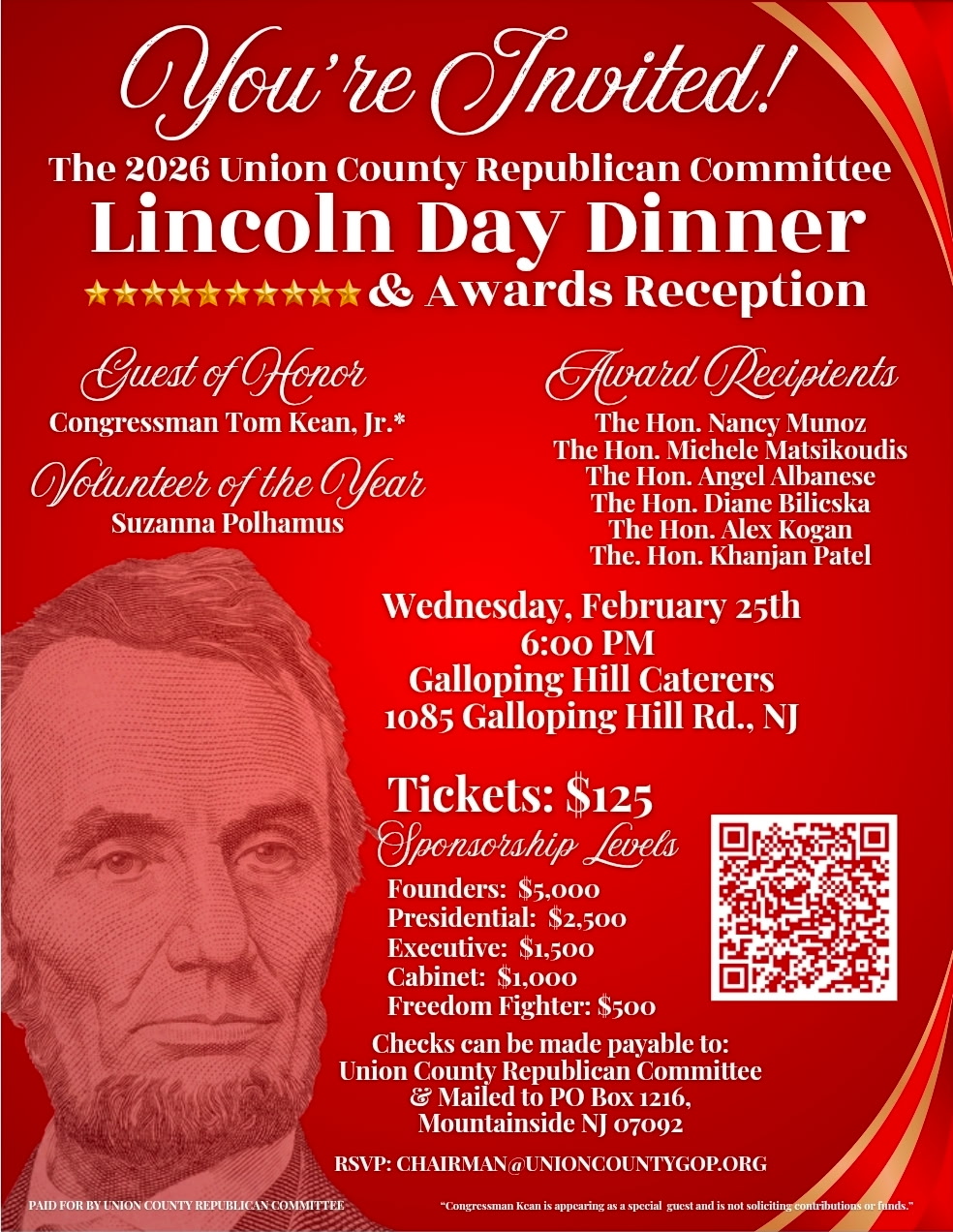 You're invited to the 2026 Union County Republican Committee Lincoln Day Dinner & Awards Reception. Guest of Honor Congressman Tom Kean, Jr. Galloping Hill Caterers 1085 Galloping Hill Rd Union, NJ Tickets: $125 Click here to RSVP Contact: [email protected]