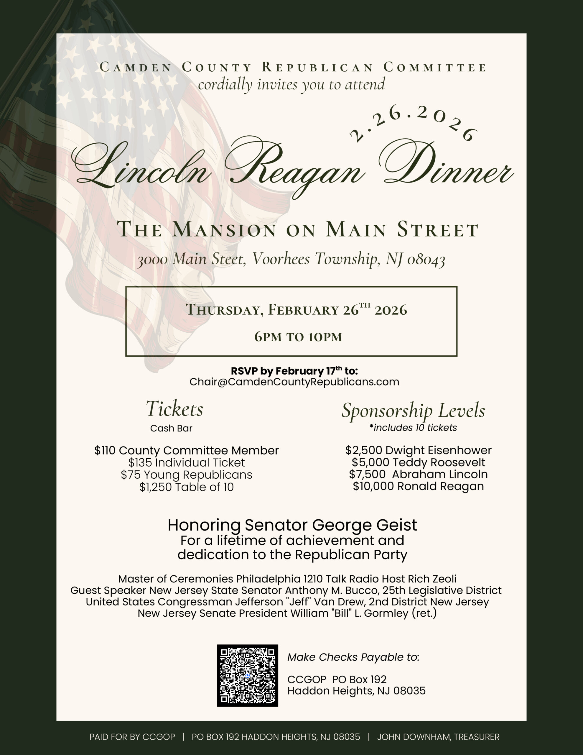 You’re Invited to the 2026 Camden County Republican Lincoln Reagan Dinner with Honored Special Guest Senator George Geist. The Mansion on Main Street 3000 Main St Voorhees Township, NJ 08043 Tickets: $75 – Young Republican $110 – County Committee Member $135 – Individual Ticket $1,250 – Table of 10 Click here to RSVP