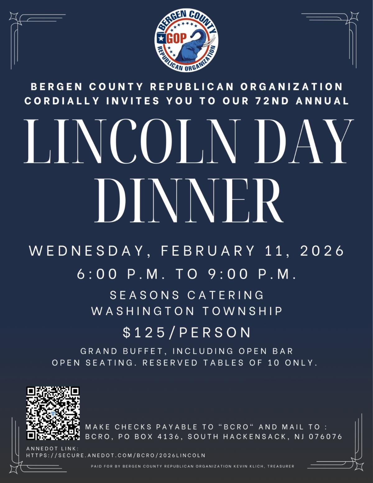 Bergen County Republican Organization cordially invites you to our 72nd Annual Lincoln Day Dinner. Seasons Catering Washington Township $125/person Grand Buffet, including Open Bar Open Seating, Reserved Tables of 10 Only Click here to RSVP